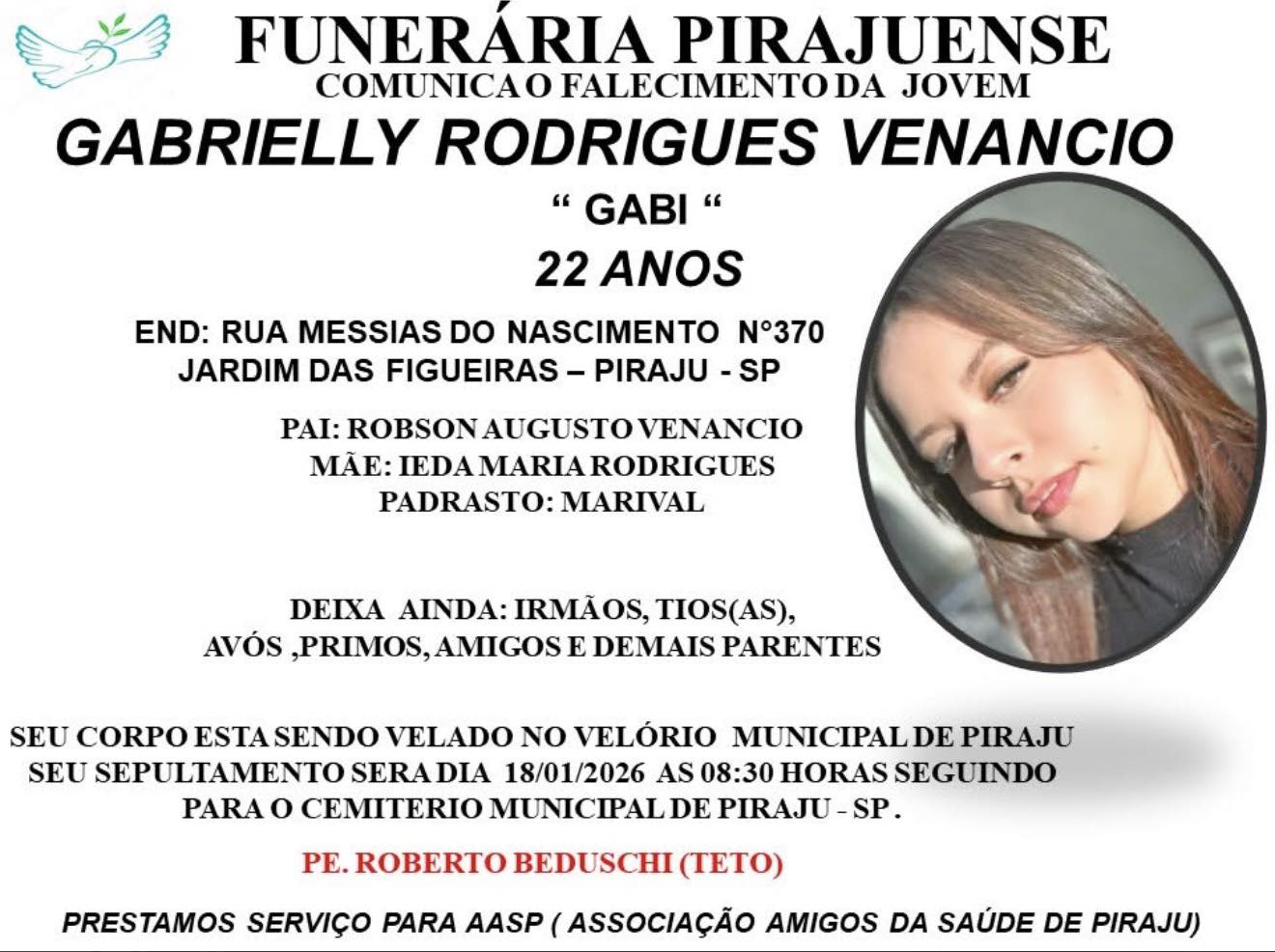 Será sepultada neste domingo, 18 de janeiro, às 8h30, no Cemitério Municipal de Piraju, Gabrielly Rodrigues Venancio, de 22 anos, auxiliar técnica de enfermagem do Hospital de Piraju, filha de Robson Augusto Venancio e Ieda Maria Rodrigues.
