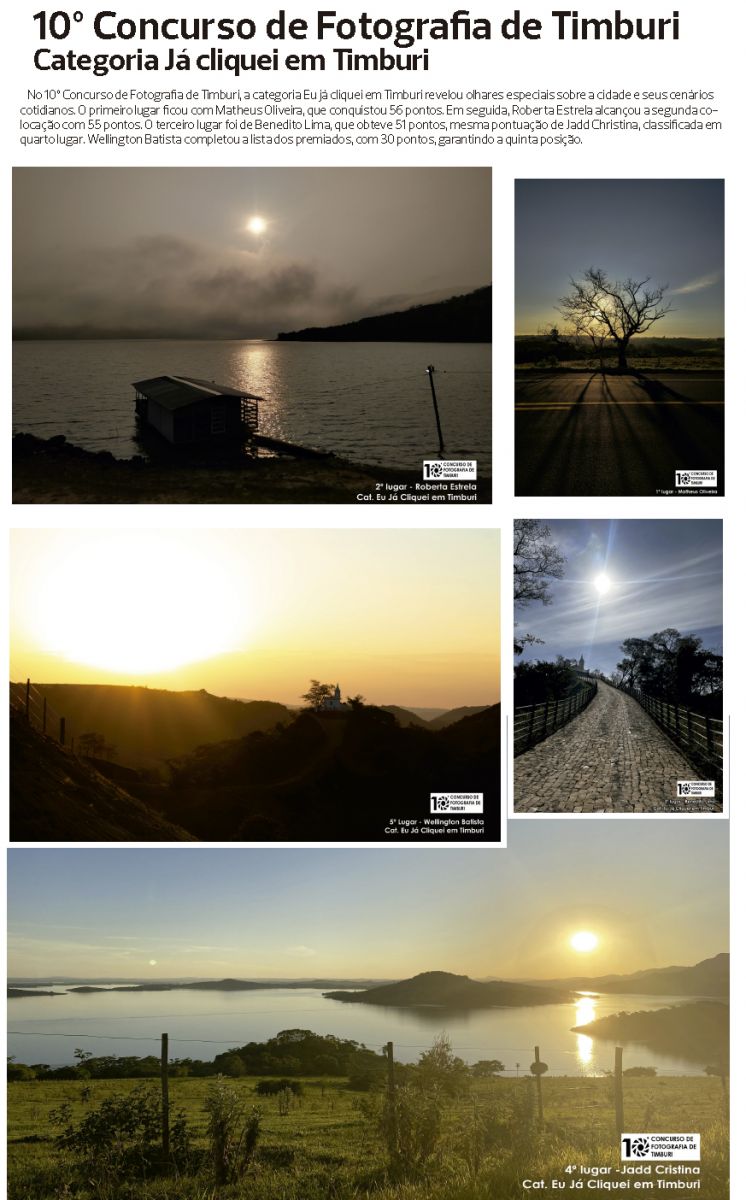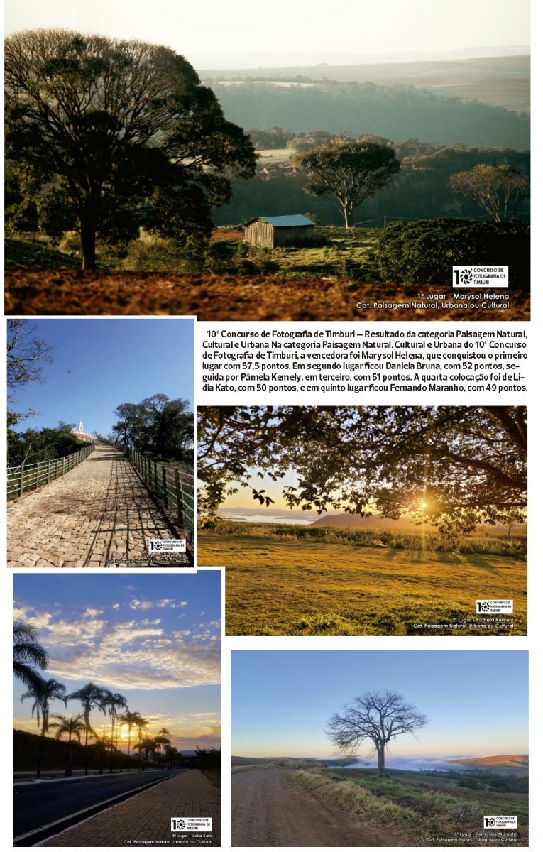 Timburi anunciou nesta semana os vencedores do 10º Concurso de Fotografia, iniciativa promovida pela Prefeitura, por meio do setor de Cultura e Turismo. O evento, já consolidado no calendário cultural da cidade, reuniu participantes em três categorias: Paisagem Natural, Cultural e Urbana, Eu já cliquei em Timburi e Retrato ou Cotidiano.