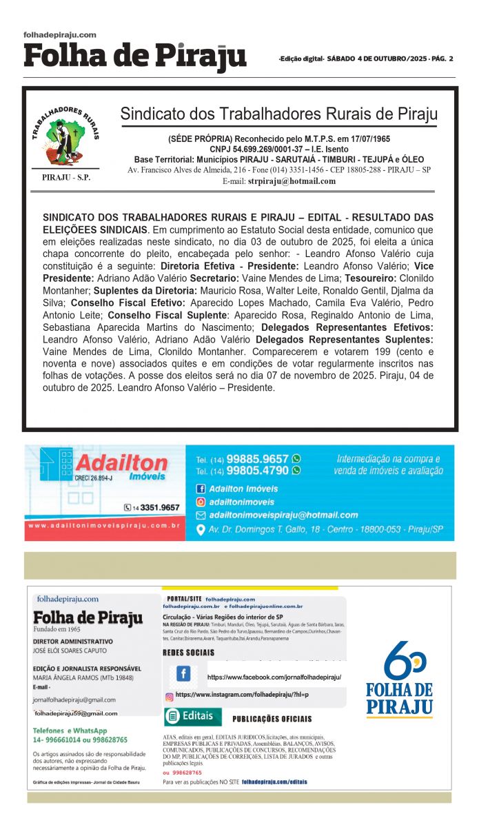 EDITAL DE RESULTADO DE ELEIÇÕES SINDICAIS EM 3 DE OUTUBRO/SINDICATO DOS TRABALHADORES RURAIS DE PIRAJU PUBLICAÇÃO EM JORNAL IMPRESSO, DIGITAL E NESTA PLATAFORMA EM 04/09/2025