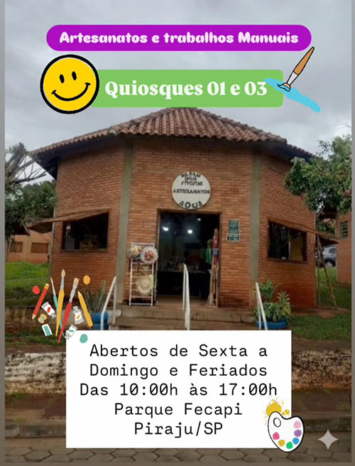 O Parque FECAPI, em Piraju, também se consolida como espaço de encontro com a arte, a criatividade e a cultura local. Instalados nos quiosques 1 e 3, artistas e artesãos do município apresentam ao público uma diversidade de produções que reúne diferentes técnicas e expressões do trabalho manual.