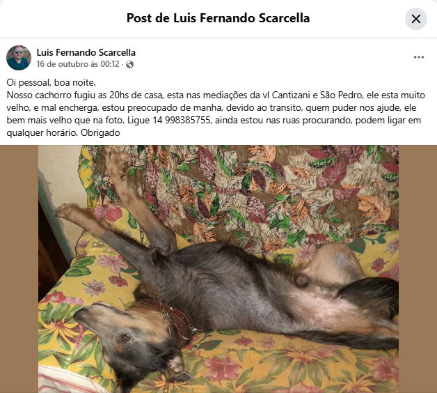 A história que começou com um pedido de ajuda nas redes sociais terminou com um final feliz em Piraju. O cachorro de um morador da Vila Cantizani, Luis Fernando Scarcella, desapareceu na noite de 16 de outubro, e a família passou a madrugada em busca do animal, que é idoso e tem dificuldades de locomoção e de visão.
