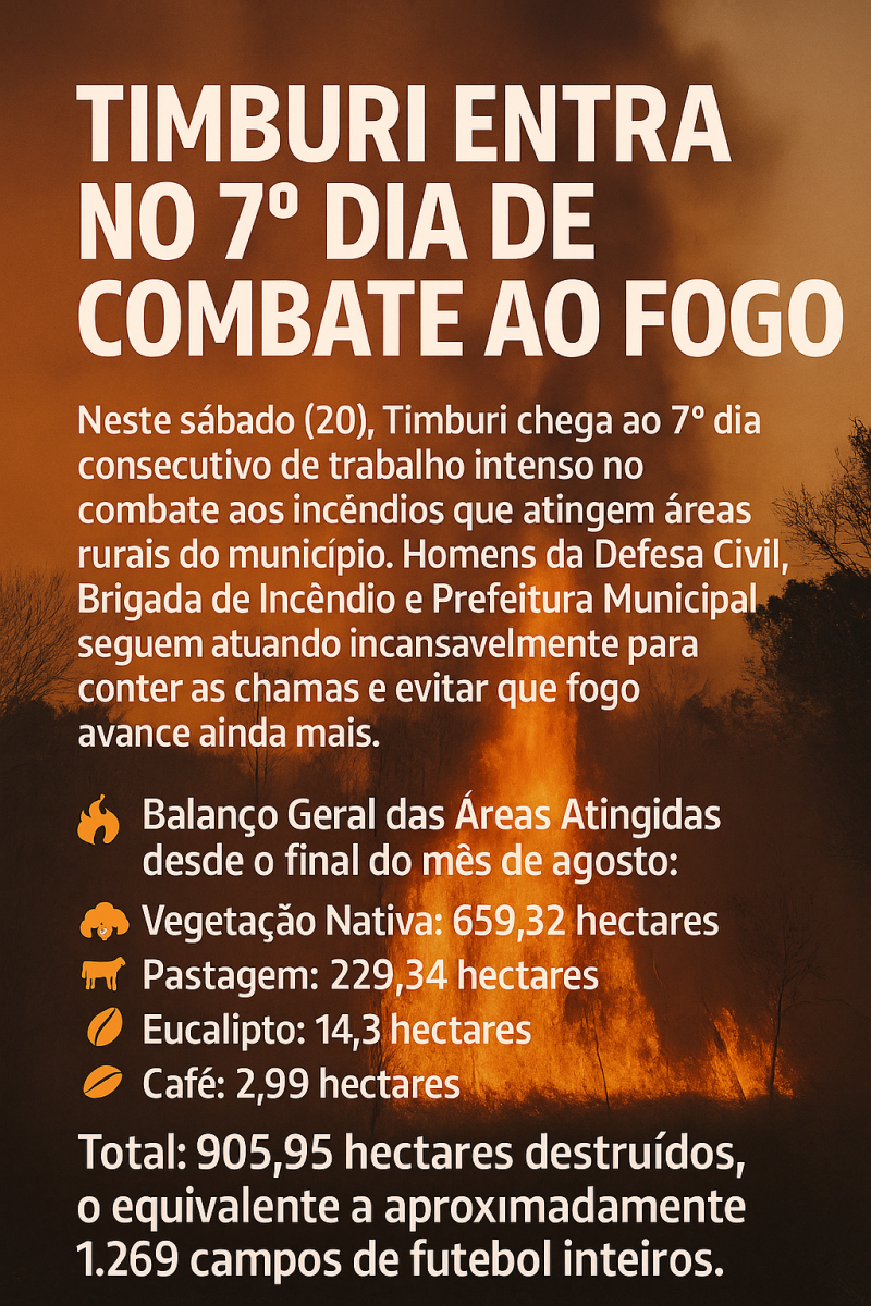 No sábado (20/09), Timburi chegou ao 7º dia consecutivo de combate aos incêndios que atingem áreas rurais do município. Homens da Defesa Civil, Brigada de Incêndio e Prefeitura Municipal seguem atuando incansavelmente para conter as chamas e evitar que o fogo avance ainda mais.