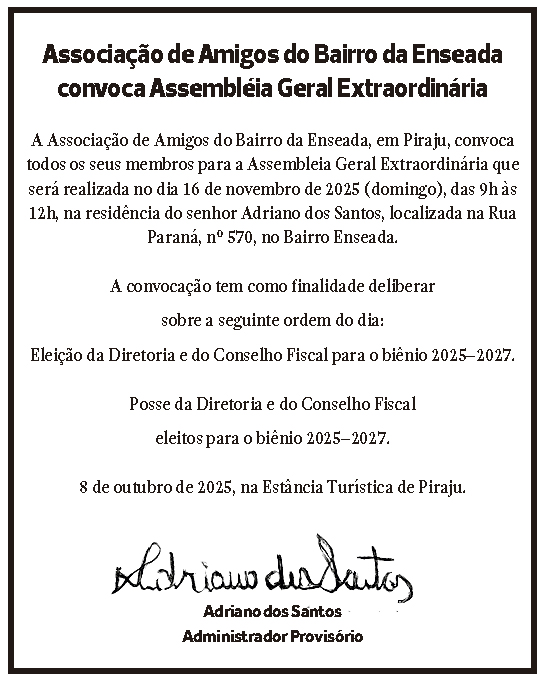 A Associação de Amigos do Bairro da Enseada, em Piraju, convoca todos os seus membros para a Assembleia Geral Extraordinária que será realizada no dia 16 de novembro de 2025 (domingo), das 9h às 12h, na residência do senhor Adriano dos Santos, localizada na Rua Paraná, nº 570, no Bairro Enseada.
