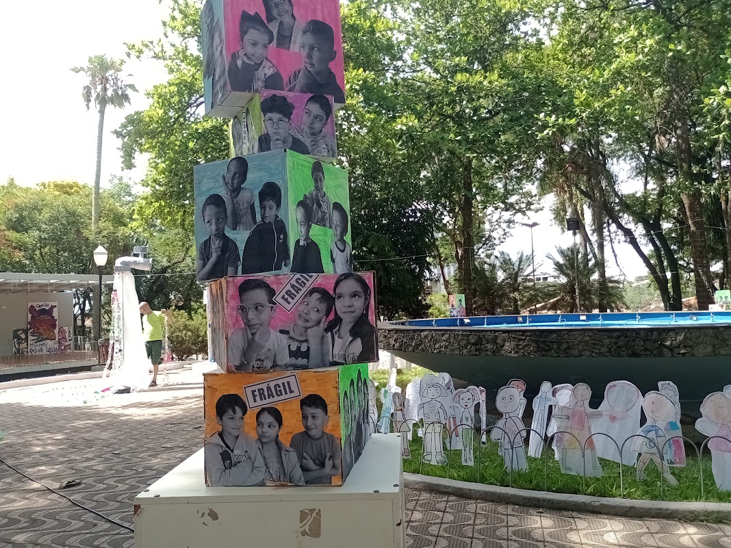 A escultura apresentada começou a ser construída a partir da arrecadação de jornais, iniciativa que contou com a participação das próprias crianças. “Alguns alunos trouxeram jornal para a escola para ajudar a montar, tudo para depois estarem decorando”, disse Diéle. A peça, instalada próxima à árvore na área da mostra, representa a Mãe Natureza.