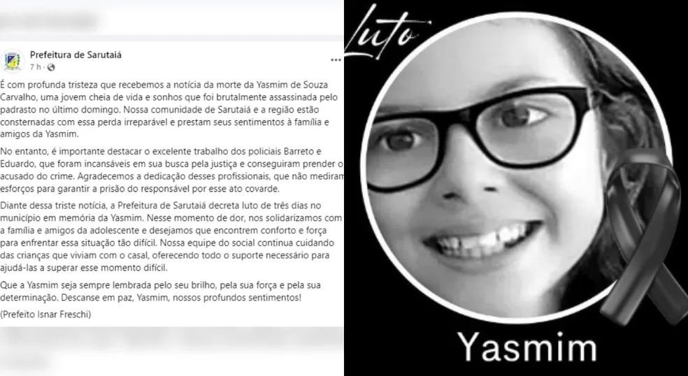 Nota da Prefeitura de Sarutaiá quando Yasmim foi morta