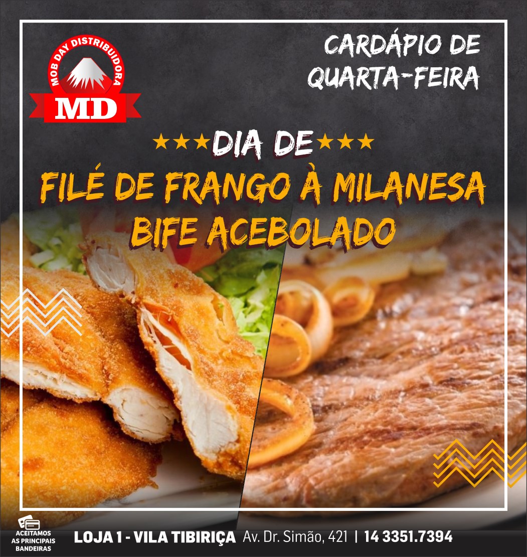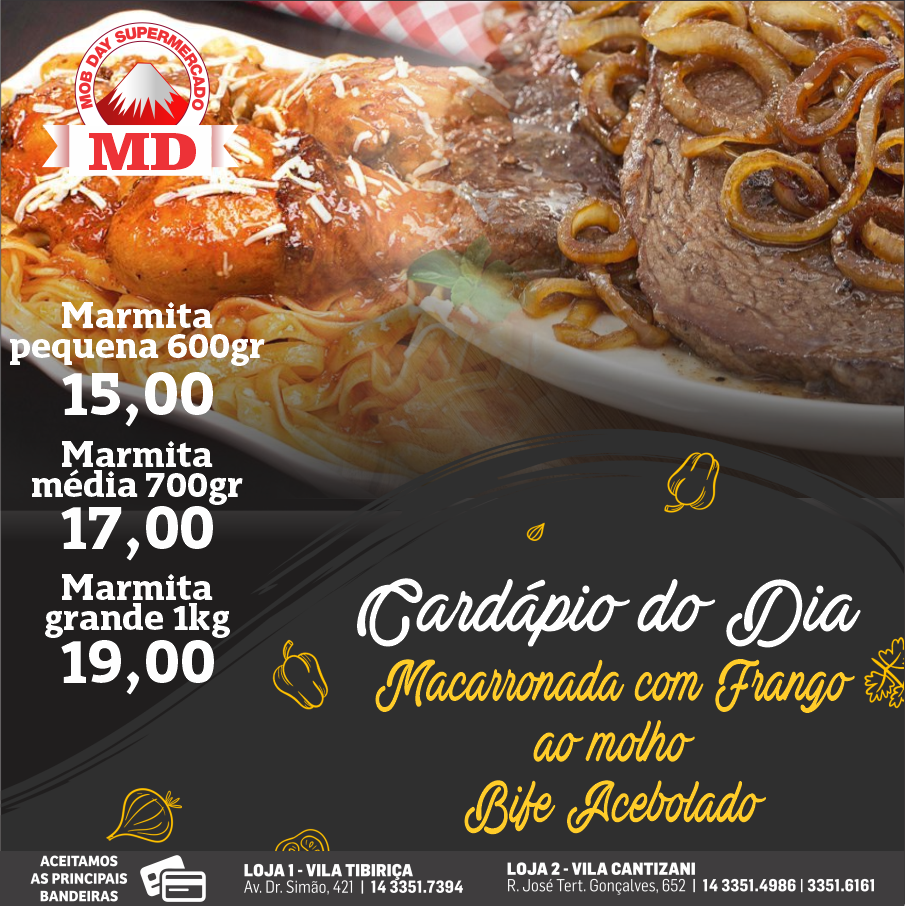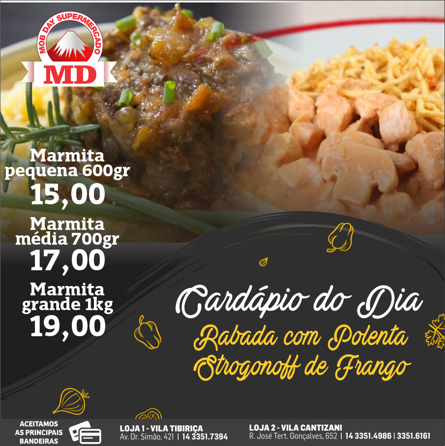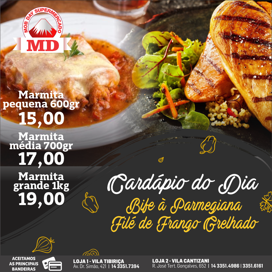Mob Day Estação tem cardápio diário delicioso. Mercado fica aberto das 9 às 20 horas e trouxe atendimento e opção diferenciada aos moradores do bairro e dos conjuntos José Ribeiro, Sérgio Garcia e Ovídio Tucunduva. Confira opções. Os pratos diários valem apenas para o Mercado Mob Day da Estação de segunda a sábado. Nos domingos é dia de assados. Importante lembrar que o Mob Day tem opções de ofertas semanais.