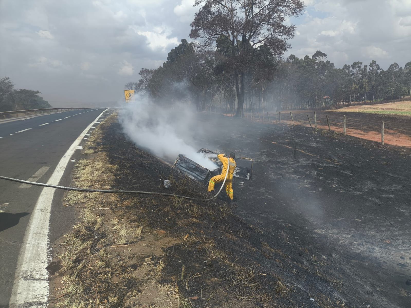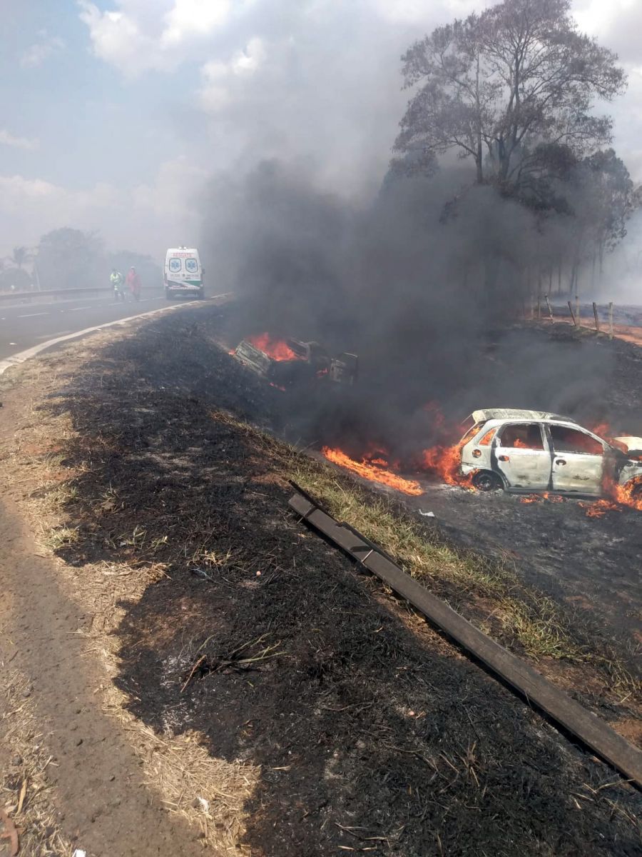 Em um declive às margens da rodovia, foram localizados dois automóveis incendiados. Em um deles não havia vítimas; no outro, três pessoas estavam em estado grave, com queimaduras de terceiro grau, e uma quarta vítima foi encontrada já sem vida, carbonizada ao lado do veículo.