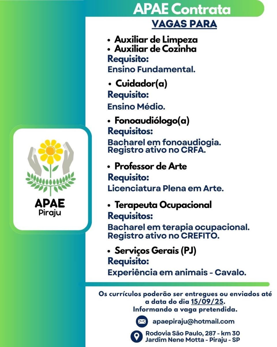 A APAE de Piraju está com inscrições abertas para a contratação de profissionais em diferentes áreas. As vagas são para auxiliar de limpeza, auxiliar de cozinha, cuidador(a), fonoaudiólogo(a), professor de arte, terapeuta ocupacional e serviços gerais (PJ).